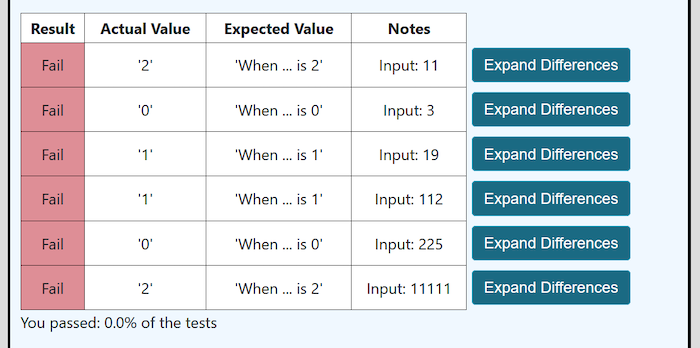 For each example input, Runestone shows you the correct (Expected Value) result, the result produced by your code (Actual Value), and whether your result is correct (Result). If the expected value or actual value is too long to be fully shown in the results table, clicking on the β€œExpand Differences” button will show that information in a popup window.